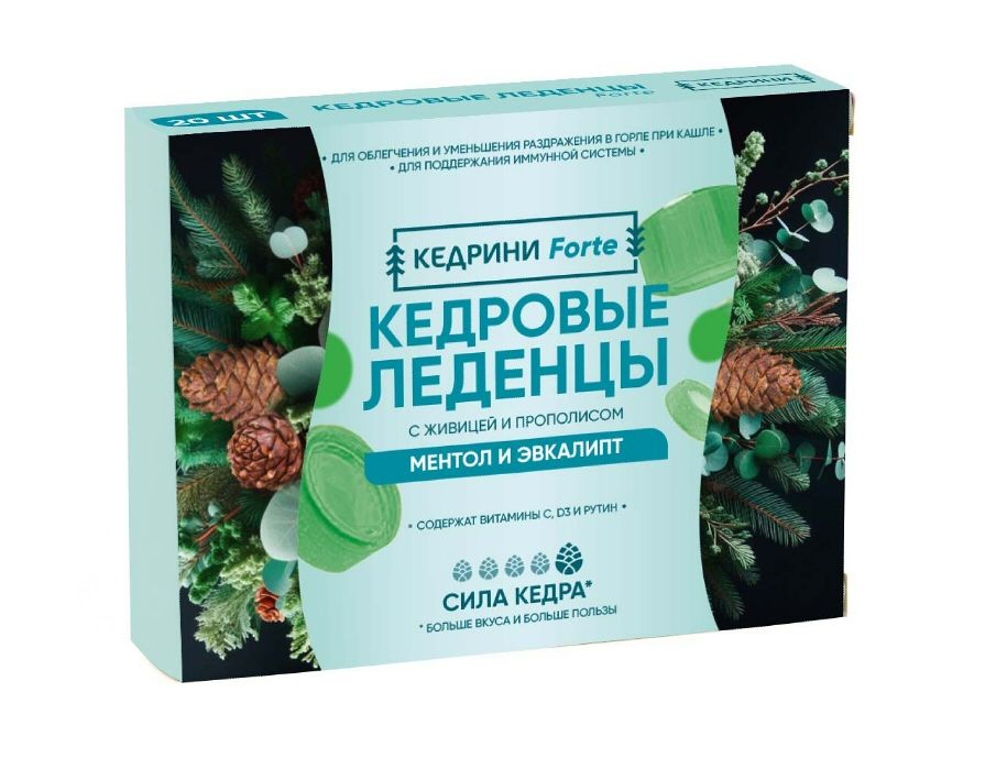Состав: сахар, патока крахмальная, кедровое масло, рутин из цветков софоры японской, кедровая живица, прополис, L-аскорбиновая кислота (витамин С), лимонная кислота, сухой экстракт листьев шалфея, холекальциферол (витамин D3); ароматизатор натуральный «Ментол», ароматизатор натуральный «Эвкалипт», комплексная пищевая добавка «Краситель натуральный «Краситель натуральный Медные комплексы хлорофиллинов АР 875»
