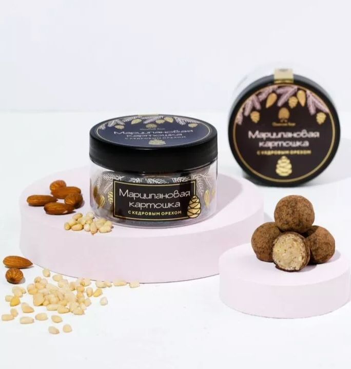 Состав: миндаль бланшированный дроблёный, горькая шоколадная масса без добавления сахара, сахар, ядро кедрового ореха, патока, водка, лецитин подсолнечный, какао-порошок, экстракт ванили натуральный
