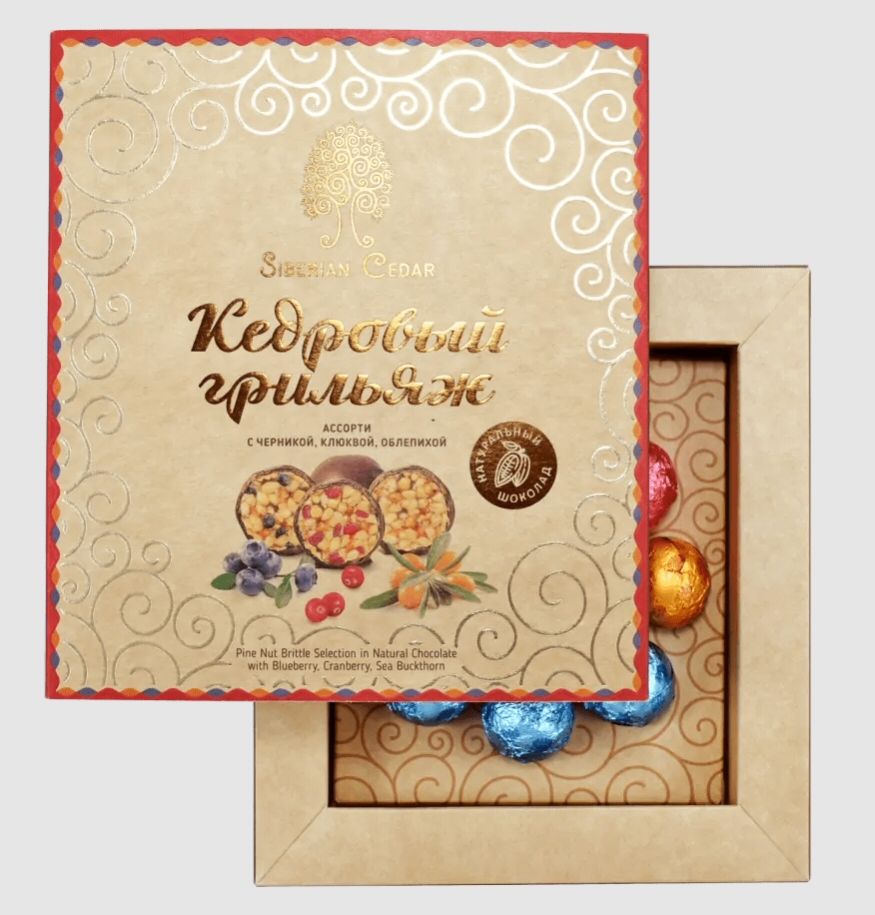 Состав: ядро кедрового ореха, шоколадная глазурь, ядро кешью, мёд натуральный, клюква вяленая, пастила облепиховая пастила черничная