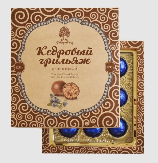 Состав: Ядро кедрового ореха, шоколадная глазурь (сахар, какао-масло, какао-порошок, эмульгатор лецитин), ядро кешью, мед натуральный, пастила черничная (пюре яблочное, ягоды черники).