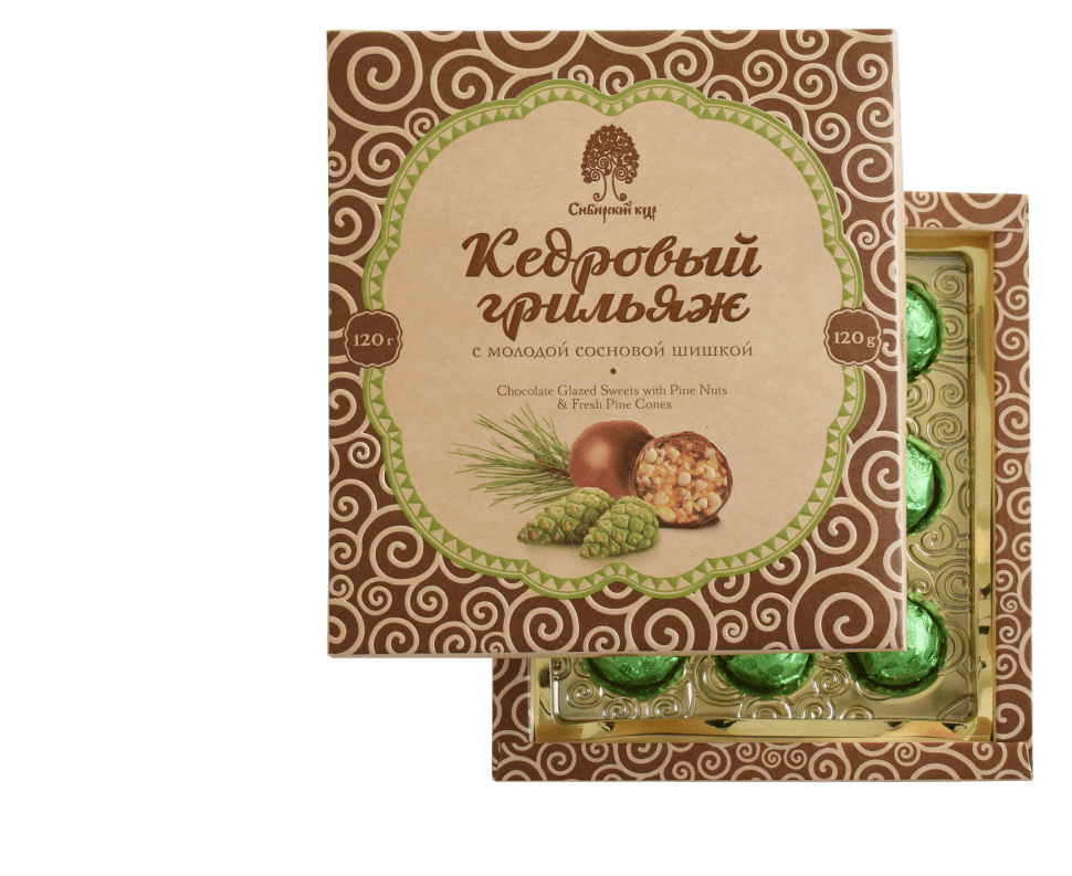 Состав: Ядро кедрового ореха, шоколадная глазурь (сахар, какао-масло, какао-порошок, эмульгатор лецитин), ядро кешью, мед натуральный, шишка сосновая, сахар.