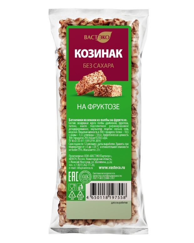 Состав: Воздушная крупа полбы дробленой, фруктоза, патока, масло подсолнечное рафинированное дезодорированное, эмульгатор лецитин соевый, соль морская