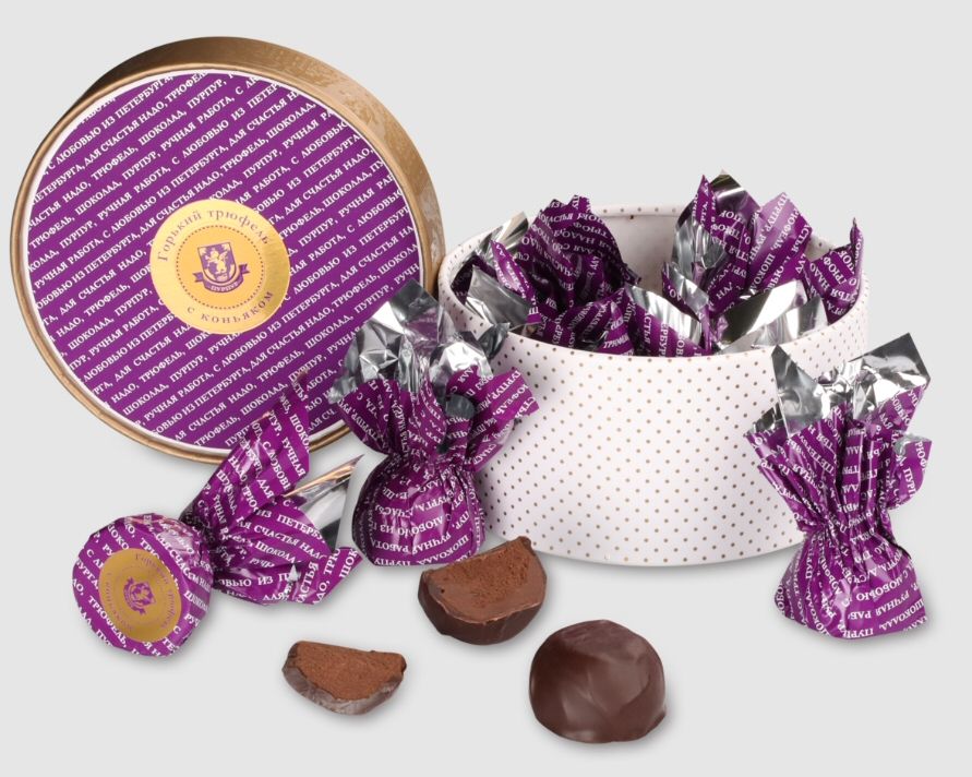 Состав: Шоколад темный (какао тертое, сахар, какао – масло, эмульгатор (подсолнечный лецитин), ваниль натуральная), масло сливочное, коньяк армянский семилетний, масло какао, какао тертое, экстракт мадагаскарской ванили