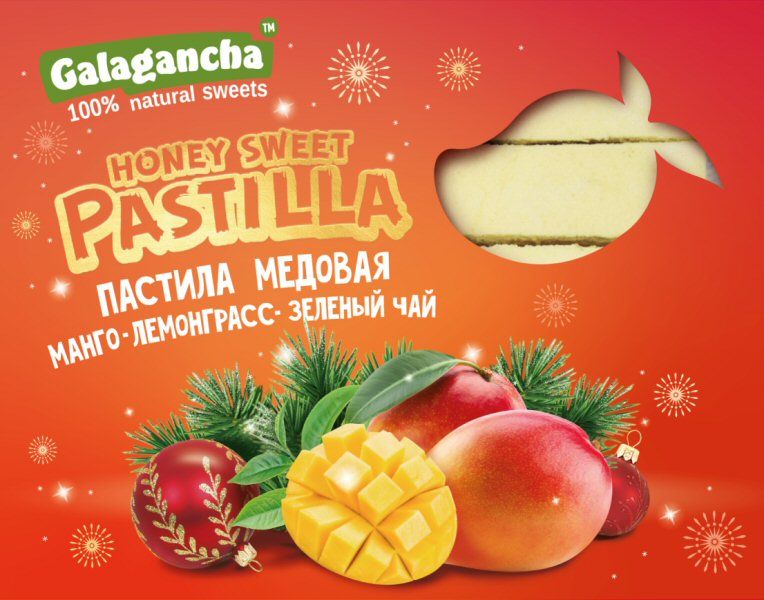 Состав: сахар, пюре яблочное, плодовый наполнитель манго-зеленый чай с экстрактом лемонграсса, патока, мёд натуральный, агар-агар, белок яичный сухой, лимонная кислота, пищевые волокна яблочные