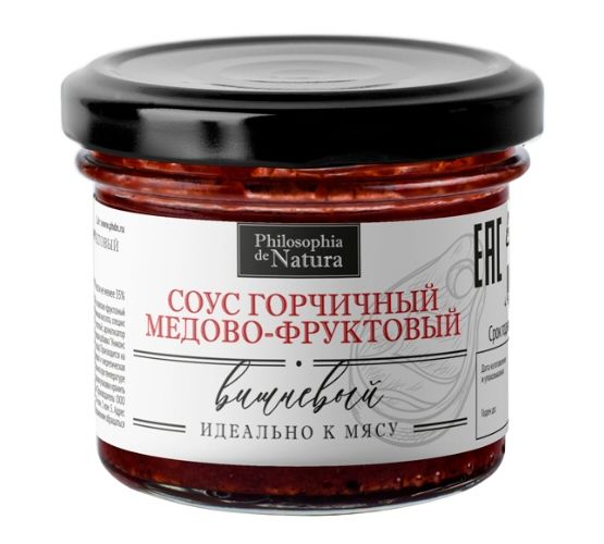 Состав: вишня свежемороженая, вода питьевая, сахар, мед натуральный, глюкозно-фруктозный сироп, загуститель-пектин, горчичный порошок, лимонная кислота, специи: перец черный молотый, ягоды можжевельника молотые, перец белый молотый; экстракт чабреца, комплексная пищевая добавка «Униконс Эко”(носитель Е466, экстракт рябины красной (водный), соль йодированная, вода)