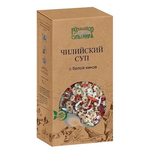 Состав: макаронные изделия из твердой пшеницы звездочки, белая киноа, сушеные морковь, томат, репчатый лук, петрушка, перец чили.