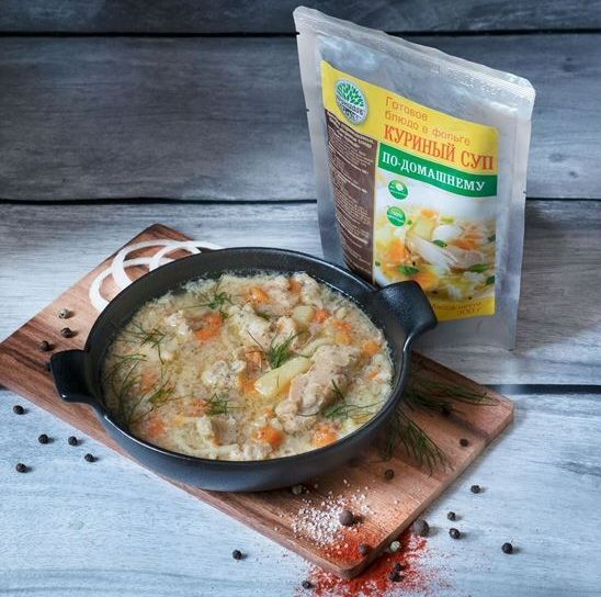 Состав: Бульон куриный, филе цыпленка, морковь свежая, картофель свежий, лук репчатый сушеный, макаронные изделия, масло растительное, укроп сушеный, соль поваренная пищевая, смесь специй