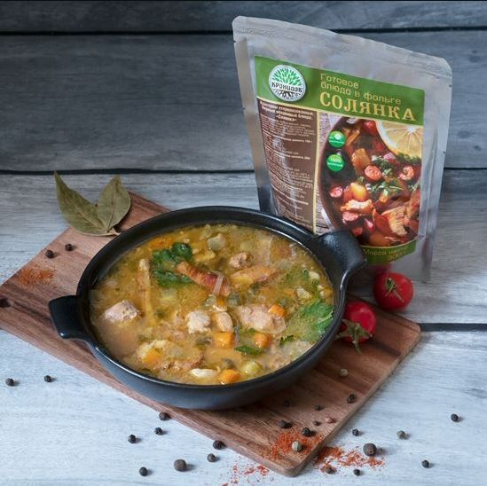 Состав: Бульон мясной, свинина, бекон свиной сырокопченый, огурцы соленые, сосиски, морковь свежая, картофель свежий, лук репчатый сушеный, томат-паста, маслины, лимон свежий, соль поваренная пищевая, смесь специй,лавровый лист