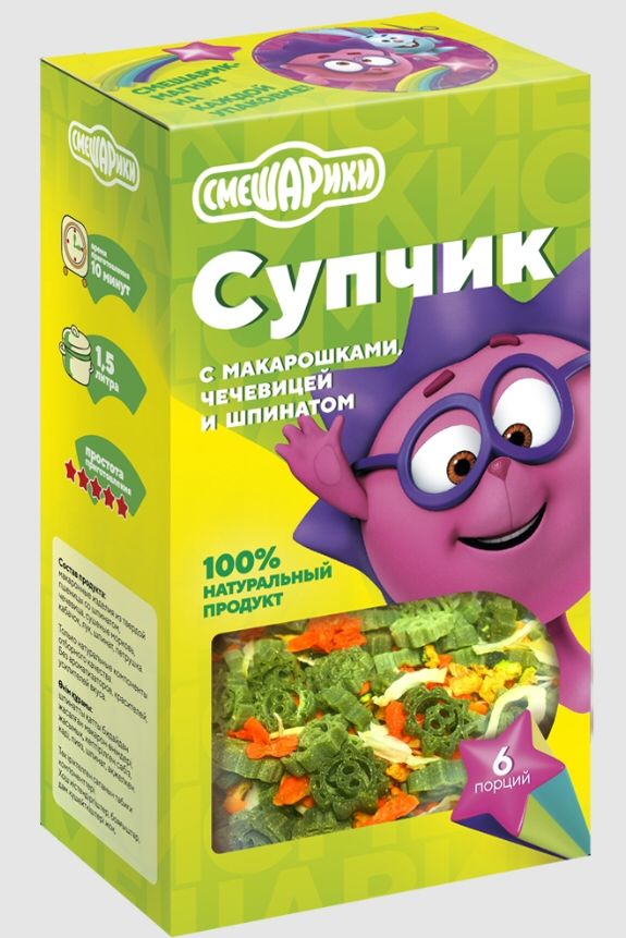 Состав: макаронные изделия из твердой пшеницы со шпинатом, чечевица, сушеные морковь, кабачок, лук, листья шпината, петрушка
