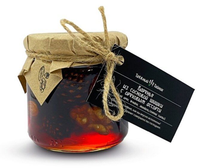 Состав: сахар,вода,сосновые шишки,грецкий орех,фундук,миндаль,лимонная кислота