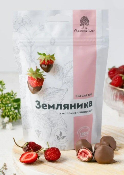 Состав: молочная шоколадная глазурь без добавления сахара; (мальтит (подсластитель); какао масло; молоко сухое цельное; какао-порошок; эмульгатор; (лецитин соевый), ванилин); ягода сублимационной сушки земляника